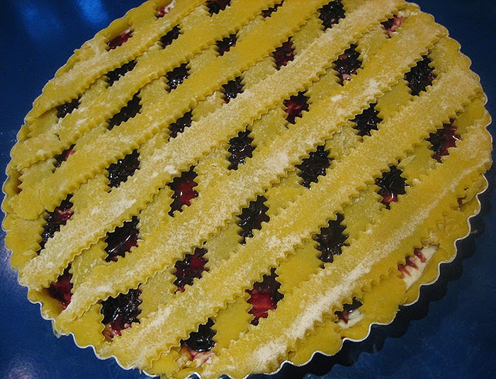 Che ci fo con la marmellata di visciole? Cosa porto per un invito a cena? Che fine farà la ricotta che ho in frigo? Tutto si congiunge nella mia mente. Recupero una ricetta ebraica che giace nell'archivio delle cose da provare. Una crostata come questa, non fatta da me, fu nel buffet di Maggio 2008. Una cena per trenta su un terrazzo romano. Fatta da me, nel menu di Dicembre 2002. Una mescolata compagnia. Fa parte delle Crostate al formaggio, Cheesecake.