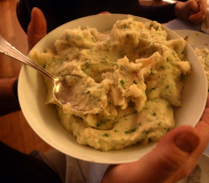 Tante patate farinose quanti topinambur, entrambi pelati e a pezzi, con un dito di acqua e sale grosso in pentola a pressione. Cinque minuti dal fischio.