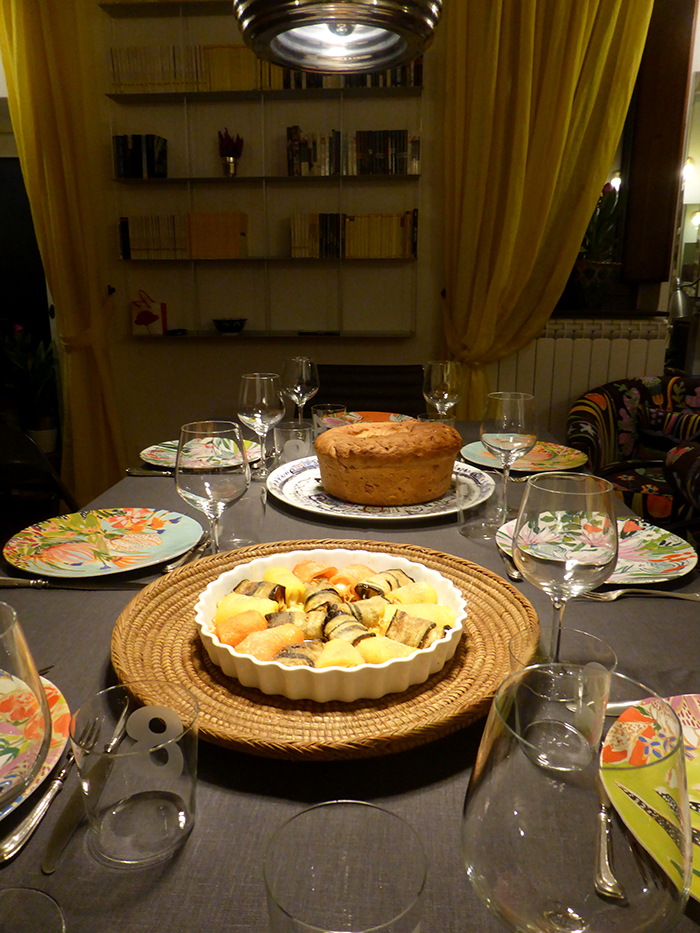 Ottobre. Nuvola si mette a tavola. Menu: Involtini gratinati di peperoni e malenzane con spaghettini, Pitta del Neretino o di Nardò, Casatiello, Formaggi di capra e mucca, Tatin di cachi e cioccolato.