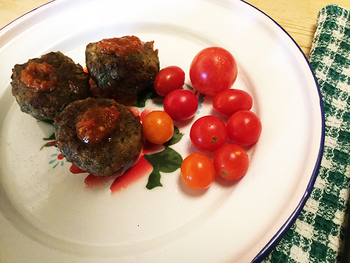 Ho parsimoniosamente irrorato le polpette di olio d’oliva e le ho messe in forno ventilato a 180°.