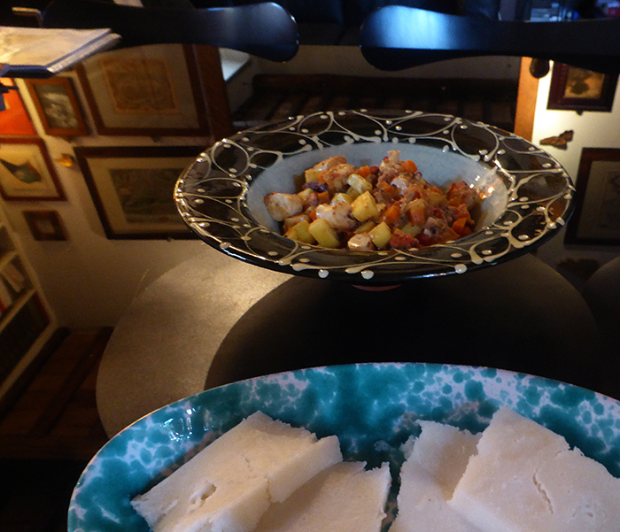 Nella prima versione ho accompagnato il polpo con della polenta bianca soda - ugali direbbero loro - con una congiunzione un po' tirata, l'ugali è più da centro del paese che da costa. Nella seconda con un pilau.