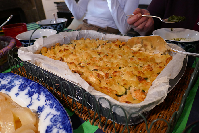 Febbraio 2019. Ammuina 3. Di nuovo tutte in cucina, sono due giorni che si lavora, si chiacchiera, si mangia. Poi dopo due giorni di fuoco: Ammuina 1, Ammuina 2, Ammuina 3, la casa si ricomporrà e tacerà. Sul tavolo: Pasta al forno con salmone zucchine, da Nadia; Spezzatino alle erbe provenzali con pere in agrodolce di Dolcesca; Palak Paneer, Spinaci indiani con formaggio di Dolcesca; Fondant au chocolat, pois chiche et datte, ovvero fondant al cioccolato, ceci e datteri da Artemisia entusiasta del nuovo dolce, tanto che questa è solo la prima di tre versioni che si succederanno rapide.