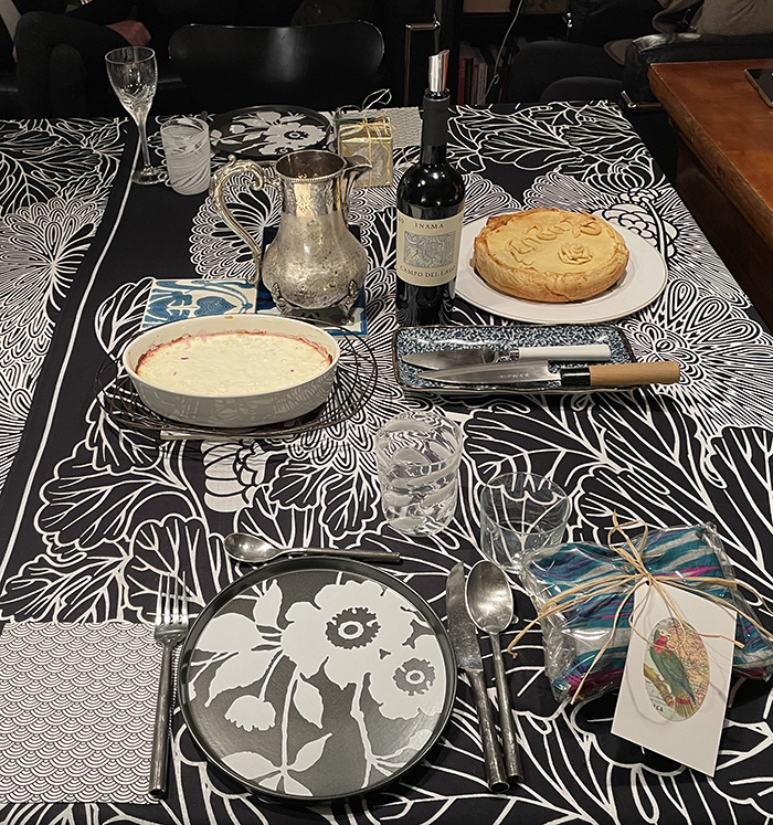 Gennaio 2022. Viviana e Barbara. Per tutto il periodo natalizio l'albero è stato un cesto a più piani pieno di pacchetti continuamente rinnovati. Pacchetti a cui faccio vestiti da bambola: sottovesti, gonnelline, ricami, cuffiette, nastri, e infine biglietti ricavati da qualsiasi pezzo di carta si presti come voglio. Dentro questo stratificato involucro c'è anche qualcosa: qualche volta di comperato, altre di acchiappato girando lo sguardo per casa. Gli ospiti in successione, cena dopo cena, prendono il loro; pacchetti restano, altri si infilano nel posto dei donati. La stanza nera - mi accorgo che in confidenza la chiamo così, per il predominio del colore nero, ai miei occhi così colorato - tutta stravolta dall'arrivo dalla smantellata Venezia (c'era una casa là, amatissima, ora lasciata e svuotata) del grande tavolo di legno con le sue belle zampe circonvolute che non ho potuto che appoggiare lì, in attesa che vada dove non so, ma dovrà andare. Addio addio caro gattone, o cavallo, o toro, non so che bestia sei, ma quelle zampe mi fanno pensare che camminerai e ci separaremo, dopo essere stati insieme per tanti anni e più case, fedelmente seguendomi, ma adesso è ora di dirci addio. Prima dei saluti però ti ho fatto lavorare per la prima volta davvero: appoggiato al tavolo nero, hai tenuto sulle spalle pacchetti, piatti, bicchieri, cibi, sei sembrato quasi indispensabile, hai quasi chiesto di restare lì.