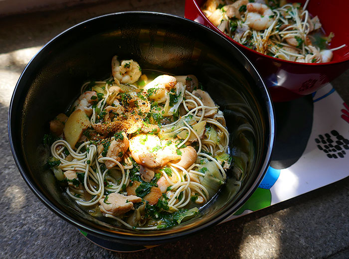 Cineseria con spaghetti di riso, pollo, gamberi.