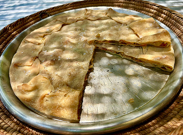Uniche differenze: quattro strati di pasta invece che due; per la pasta matta ho usato il rosso liquido ottenuto scolando cipolle e pomodori; ho aggiunto sale grosso sul coperchio di pasta. Si scalda benissimo nella friggitrice ad aria, che la rende croccante. Ne avevo già fatta una versione plissettata con pasta allo strutto, che merita: Torta plissettata di cipolle e pomodori. Liguria.