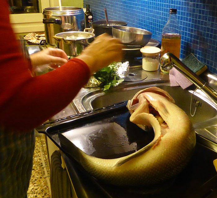 Ecco un modo di gustare il pesce sbrigativo, salutare e soprattutto ottimo. E' una cottura al sale di sicura riuscita, adatta a orate, saraghi, dentici, spigole di taglia varia, di garantita ottima qualità e freschezza, perchè ciò che si apprezzerà è proprio il sapore del pesce. Consiglio pesce "di mare"; se di allevamento, ho verificato la sufficiente buona qualità delle orate allevate a Orbetello. Il pesce va pulito e non squamato. Un'ora prima della cottura, in una teglia antiaderente, o su carta da forno, spargete del sale grosso ed appoggiatevi il pesce. Nella pancia non metto niente. Se non potete resistere, qualche profumo non troppo invadente può essere gradevole. Spargete sul pesce altro sale grosso, non preoccupandovi ossessivamente di ricoprirlo completamente, né di creargli una coltre spessa. Osservando i tempi che indico il pesce rimane umido, la coda non rinsecchisce, le parti vicino alla lisca diventano appena rosate. Accanto, a seconda della stagione, verdure, ortaggi, tuberi e radici di diversi colori; che non manchi mai una buona patata, lei sì profumata di olio d'oliva e.v. eccellente. Artemisia lo prova e lo trova squisito; spigola di 1k e mezzo, 20' circa di forno, nessun aroma aggiunto, come Polsonetta suggerisce. Confrontare la ricetta con il Branzino al sale con aromi di Isolina. Nel menu di Maggio 2012. La cena dei due pesci. Le foto più allegre, con Polsonetta al comando, sono quelle di Dicembre 2017. Venezia. L'ultimo dell'anno. Nell'ultimo giorno dell'anno facciamo la spesa nel mercato del pesce di Mestre, ricchissimo e conveniente. Troviamo una spigola di tre chili e trecento grammi, ce la danno come fosse un trofeo. Frigoriferi veneziani: l'altana. Il carrello contenne la spigola per un giorno e una notte. Abbiamo avuto l’incubo che un nugolo di gabbiani se ne accorgesse. Quando si capì che non sarebbe entrata nella teglia se non guizzando, si decise che così sarebbe stato; questa volta si farcì, di prezzemolo e buccia di limone senza il bianco, si cucì in modo da poterla rovesciare sul dorso e piegarla, la si cosse al massimo della temperatura del forno per 50', la si trovò squisita. Attenzione, come sempre, quando si sbuccia il pesce cotto: la pelle salata e irrigidita va aperta e lasciata lì, torno torno, in modo che i filetti, se cadono mentre li preleviamo, non precipitino nel sale. Alcuni barbari potrebbero chiedere olio d'oliva a tavola per condire il pesce, ma non è per niente necessario; noi ci mettemmo comunque accanto la Crema di yogurt, quasi una maionese. Nel menu di Agosto 2018. L'unica cena del mese, ma sul terrazzo ci fu una spigola di 1kg e 300, cottura circa 20' (foto con tovaglia rossa). Nel menu di Gennaio 2019. La sera della Befana-Luna, due spigole da un chilo e passa l'una, 30' con forno alla massima potenza. Un quarto d'ora al chilo. Il pesce era stato squamato per sbaglio: no problem, come aveva detto la pescivendola.