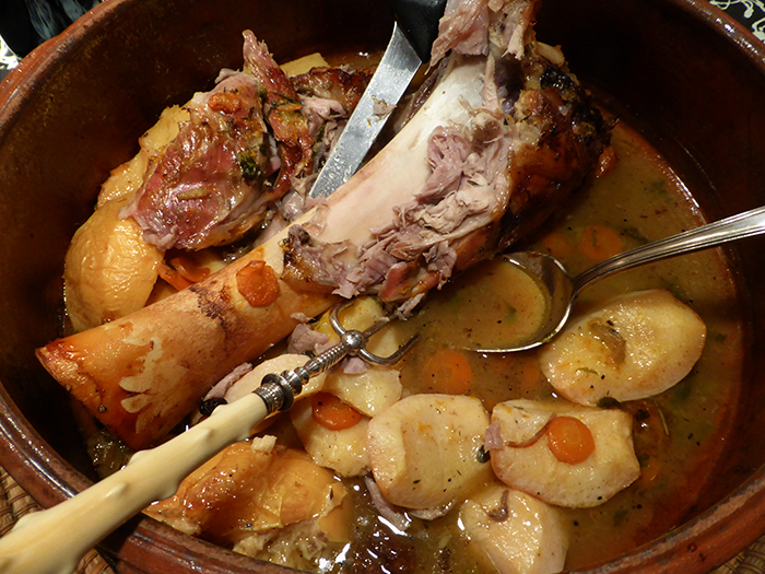 La carne si ritirerà dall'osso e il grasso colerà sul fondo, mescolandosi alle verdure e caramellizzando; a fine cottura, con l'aggiunta del succo di un'arancia e pepe appena macinato, sarà la salsa. La lunga cottura fa sciogliere il collagene, molto abbondante in questo taglio di carne; ma tutto deve essere ben caldo, compresi i piatti. Non provate a scaldarlo dopo che si è raffreddato; deve essere appena uscito dal forno.