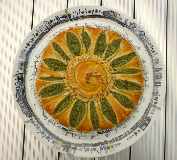 Vagheggiando e inseguendo le infinite torte a fiore o stella presenti sul web, m'è venuta, per caso, mettendomi a fare, questa nuova forma. L'ho contemplata con compiacimento, e visto che non ha a che fare con alcun fiorellino, ho pensato fosse lo Scudo d'Atena. Nel menu di Maggio 2016. Uno spuntino propiziatorio per una Rivista.