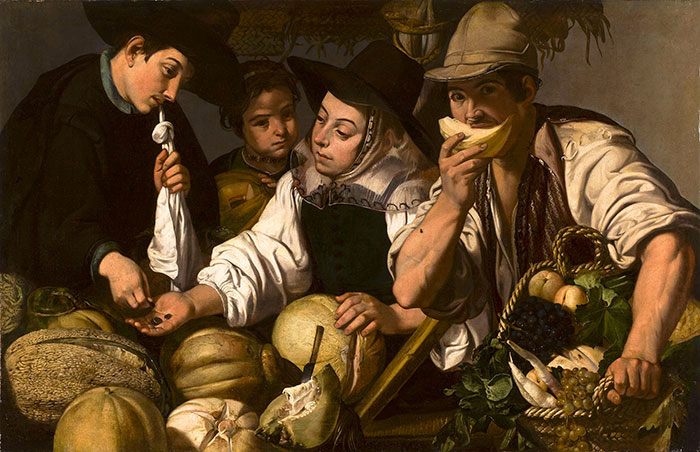 Ho trovato un altro dipinto con il raro tema della persona che mette in bocca il cibo, lo mastica. Come sempre, è un popolano, e lo divora. Nella foga, un seme del melone gli si è attaccato al naso; viene sorpreso come in un'istantanea, a metà di un gesto "naturale", non studiato; il ragazzo dipinto non ha il potere di definire la sua identità, come un signore che si metta in posa, magari con intorno gli oggetti che debbono rappresentarlo; viene definito dal pittore. Come vorace, animalesco. Ma anche vitale. E' il personaggio che buca a tela e lo spazio bidimensionale per guardarci, interrompendo il rituale della scena di mercato.