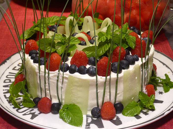 Luglio 2018. Incontro con smörgåstårta e luna rossa. Ultimo incontro di lavoro prima delle vacanze, siamo nove, siamo vivi. Fuori luce la luna rossa che appare ogni mille secoli, trasparente velo di cipolla arrossita tra cortine di lievi nubi che vanno e vengono, sotto di lei un ben più luminoso demonio piccolo e puntuto: Marte, dicono; ci avventuriamo sul legno che scricchiola stupito nel buio terrazzo, inciampando e indicando. Menu: Gaspacho di anguria; Smörgåstårta o torta tramezzino (l'officina che è in me voleva provarla, la faccio con salmone sia affumicato che fresco); Gamberetti all'arancia; Dip di ricotta e pomodori secchi; Pomodorini spaccati; Pane azzimo; Torta di ciliegie (ne andavo inseguendo una mangiata a Vienna; questa venne troppo asciutta, subito dopo ne trovai un'altra più convincente); Gelato di questo e di quello.