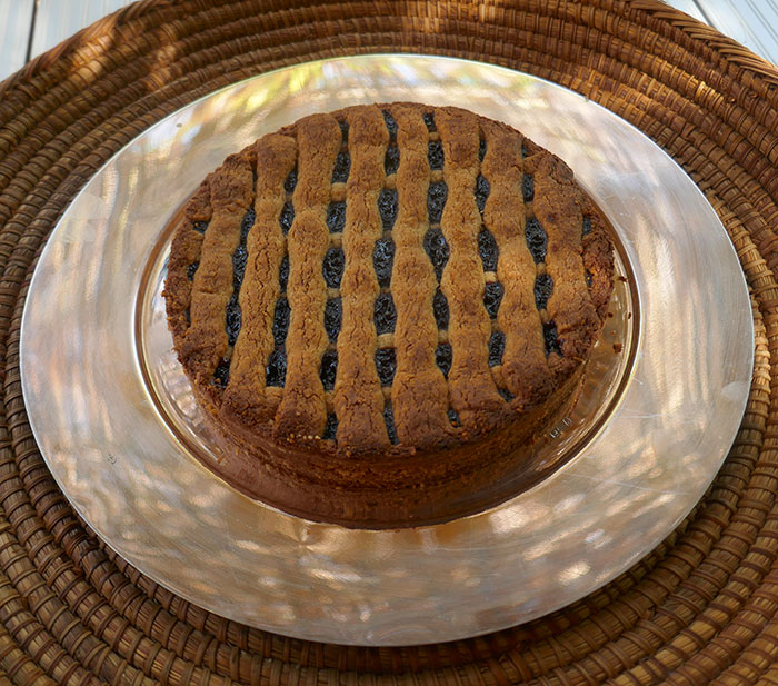 Si può fare la cottura del guscio in bianco, 20'; poi mettere la marmellata e la griglia, e cuocere altri 20'. Oppure (questa volta ho fatto così) metterà subito la marmellata, uno strato non sottilissimo, e farvi su una griglia polputa che non la farà seccare.