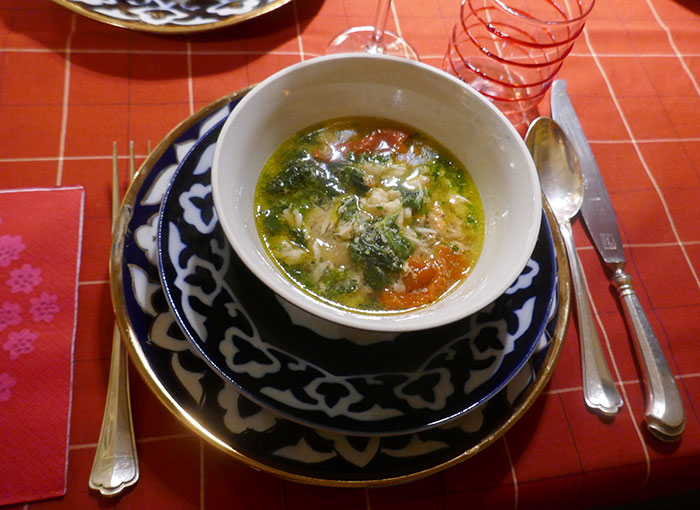 Passano le stagioni, la vite americana diventa rossa, arriva Natale, e noi siamo sempre rintanati. Zuppetta di pesce all'acqua pazza. Veramente, più minestra che zuppa, poiché è così densa da non aver bisogno di crostini. Come ogni volta, non so se rallegrarmi o avere il nervoso quando vedo che una cosa semplice e venuta fuori per caso è buonissima. Comunque prendo nota.